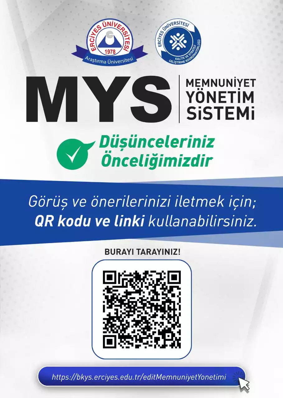 Değerli paydaşlarımız, görüş ve önerileriniz yönetim süreçlerimizi geliştirmemiz ve iyileştirmemiz için değerlidir. Aşağıdaki link aracılığıyla ulaşabileceğiniz MEMNUNİYET YÖNETİM SİSTEMİ BİLDİRİM FORMU ile dilek, istek, memnuniyet, şikayet, fikir ve önerilerinizi bizimle paylaşabilirsiniz. Memnuniyet Yönetim Sistemi (MYS) için tıklayınız..